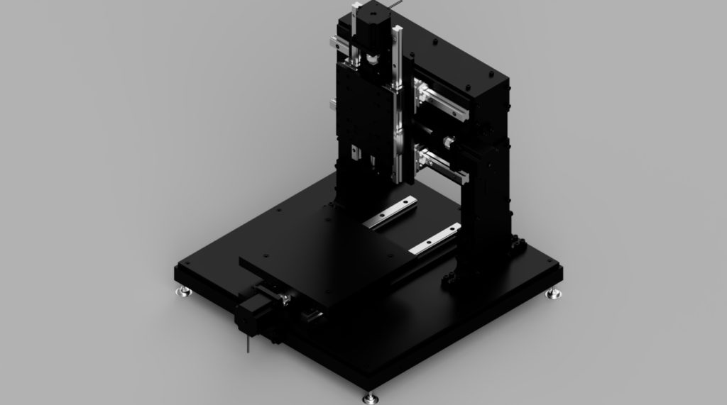 スチール材で門型構造を形成、XYZ3軸に高精度直動部品を使用し、部品構成を最小限にして価格を抑えたCNC3軸小型卓上加工機です。